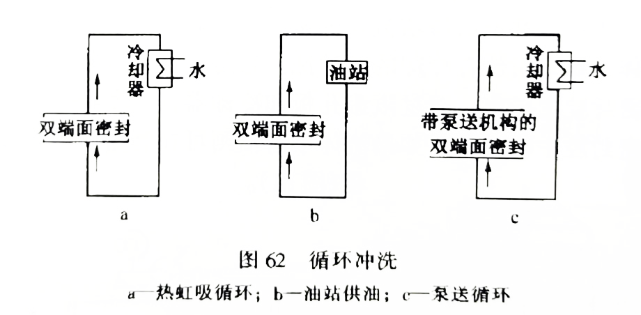 循環沖洗是經過一個泵送設備使外加的密封流體進行循環(圖62)。這里有兩點需引起留意,一是“泵送設備”,可以是外加的油站和密封腔構成閉合回路進行循環,也可在密封腔中裝設一個泵,或者是用熱虹吸的原理使流體循環。另一點要留意的是“外加的密封流體”。這種沖刷方式用在雙端面或多端面密封上,在單端面密封上不采用。循環沖刷也有人稱為“外循環”。